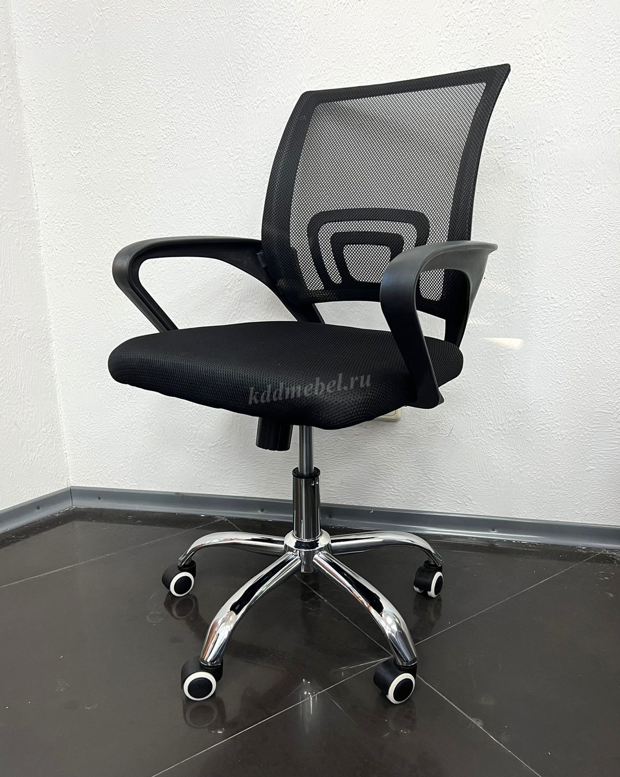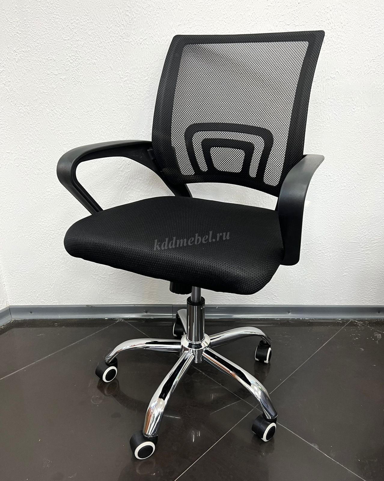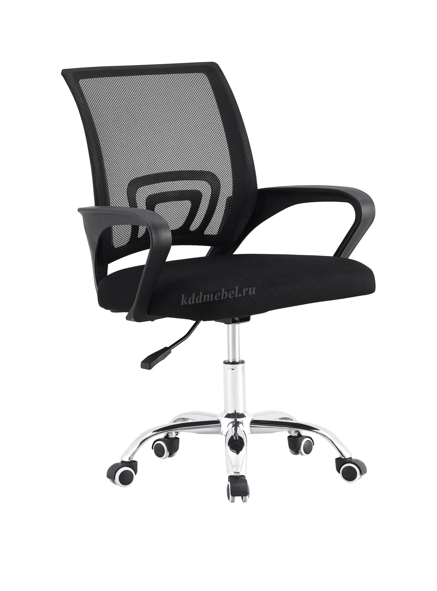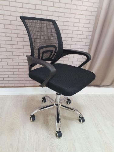 Современное офисное кресло с удобной спинкой, сиденьем из акриловой сетки и устойчивым пятилучным хромированным основанием, снабжённым 50-мм двойными колёсиками.