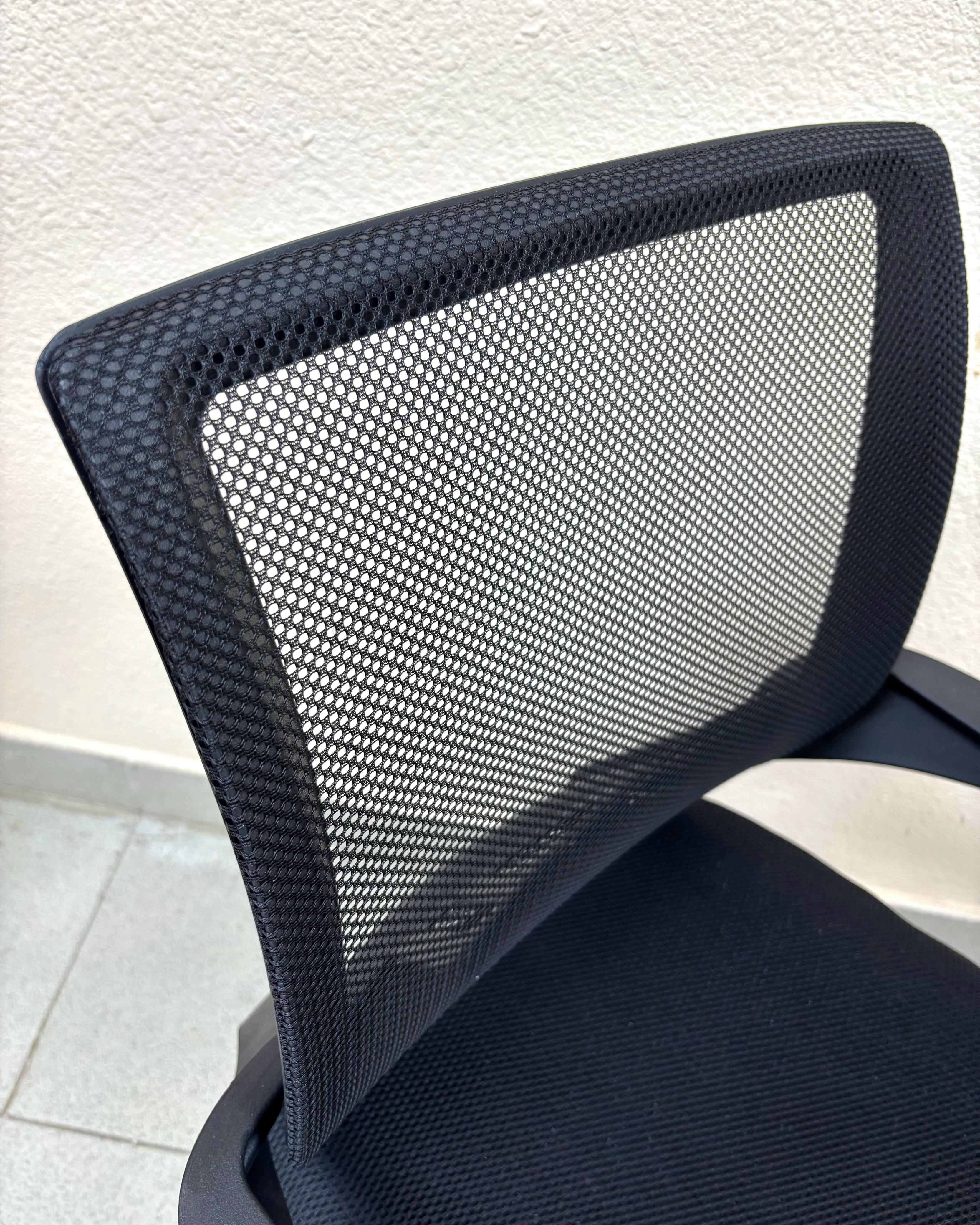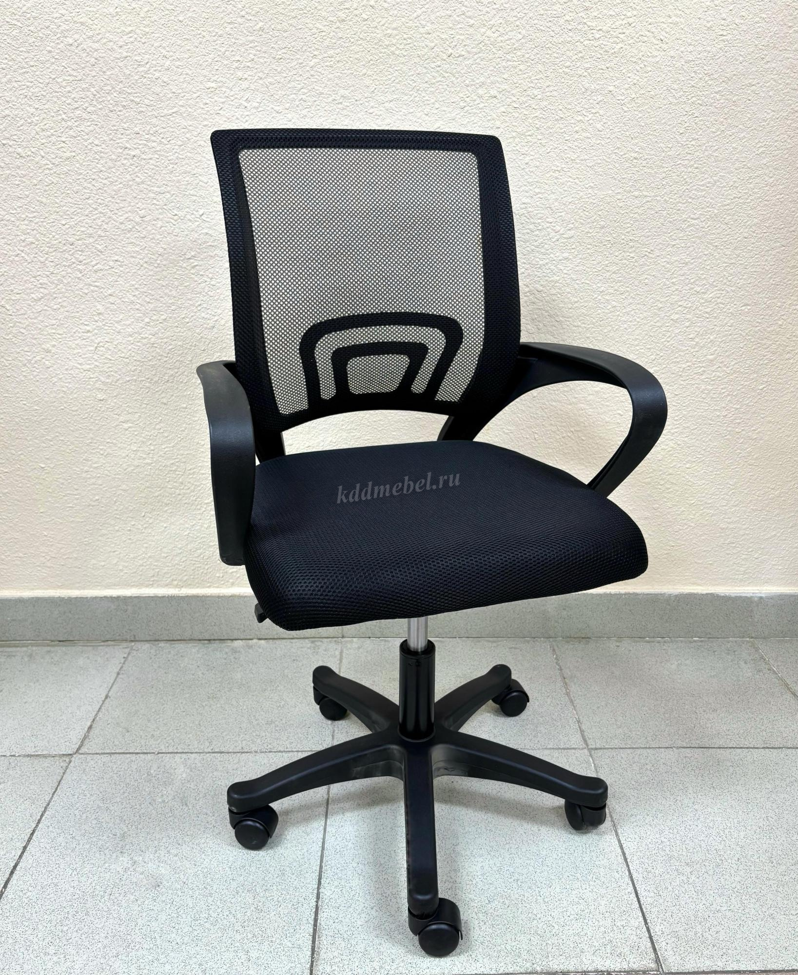 Современное офисное кресло с удобной спинкой, сиденьем из акриловой сетки и устойчивым пятилучным пластиковым основанием, снабжённым 50-мм двойными колёсиками.
